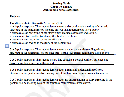 My eighth grade drama class is currently working on scenes from “Merchant of Venice.” In the previous year, they passed the eighth grade Essential Academic Learning Requirements (EALR) standards, dictated by the Office of Superintendent of Public Instruction (OSPI). This year, they are working towards basic high school proficiency (9th and 10th grade EALR levels). To do this they must pass a series of Grade Level Expectations and OSPI Assessments. These assessments cover areas of character physicality and speech. Both of these components are tested in a summative rubric used at the end of the 10-week long unit. This summative rubric is derived from the EALR standards at the desired grade level.