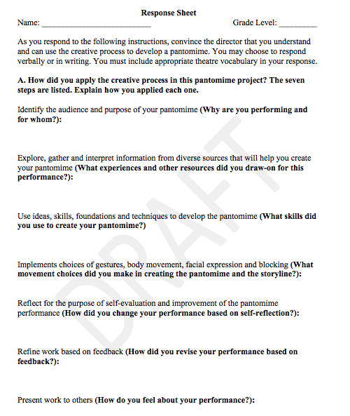 This year, to help my students achieve this substantial jump in skill level, from eighth grade to tenth, they are taking the OSPI Assessments throughout the unit in a formative format. I do not attach a grade to the assessments because I want the students to remain focused on their progress and their abilities. Removing any graded portion gives students the permission to take creative risks in the assessment (which is a central skill in drama). The skills that are evaluated (such as facial expression as a part of character physicality and enunciation as a part of speech) appear multiple times in rubrics and lessons throughout the semester.