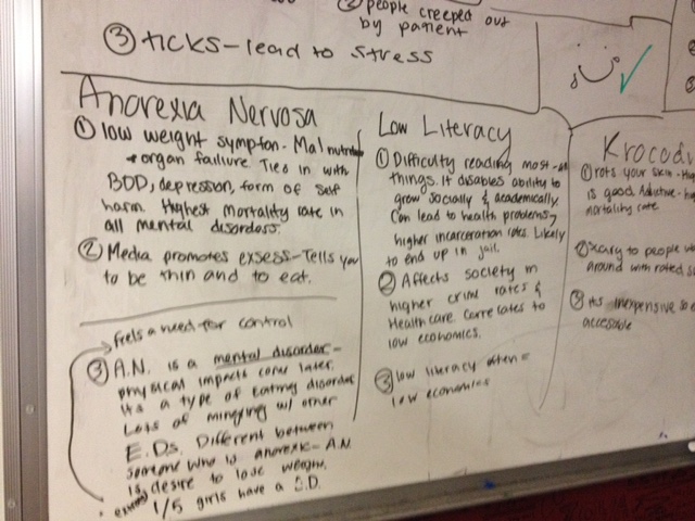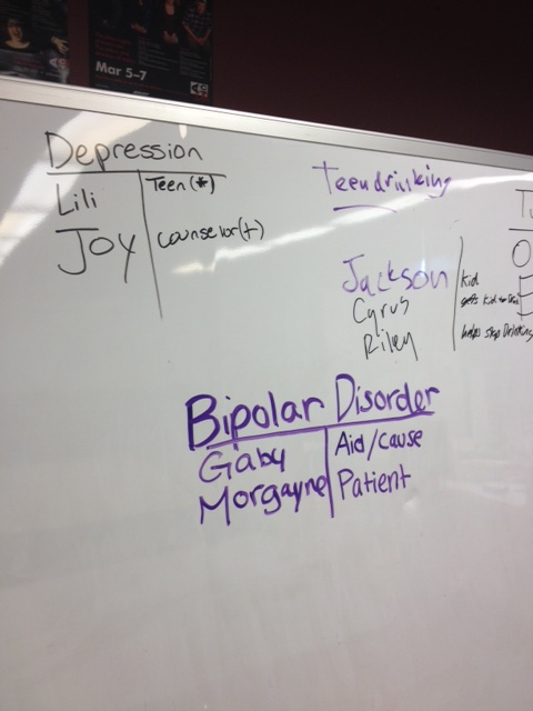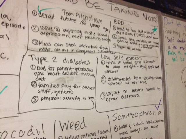 This project started with student research; this research was summed up in a inter-disciplinary meeting that shared the outcomes across content areas between drama and health. These pictures represent the research compiled by the students.